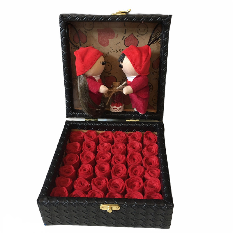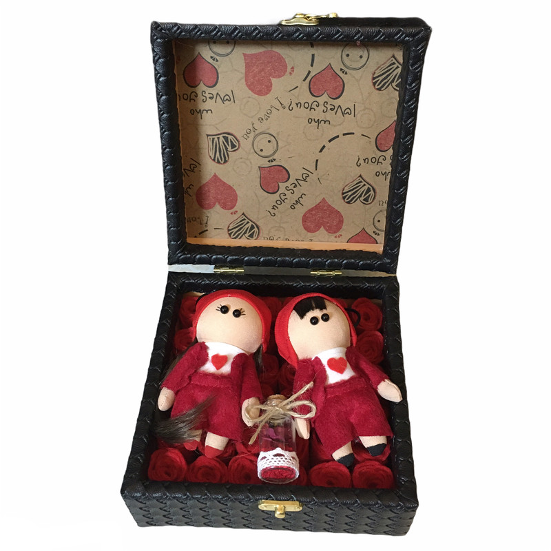 ست هديه شامل باكس چوبي قفل دار با روكش چرم به ابعاد 20x20x9، دو عدد عروسك طرح دختر و پسر روسى 12 سانتى مترى(دست عروسكها قابليت حركت دارد)،شيشه تزيينى و 36 عدد گل نمدى است.اين ست ميتواند هديه اى زيبا براى عزيزانتان باشد.