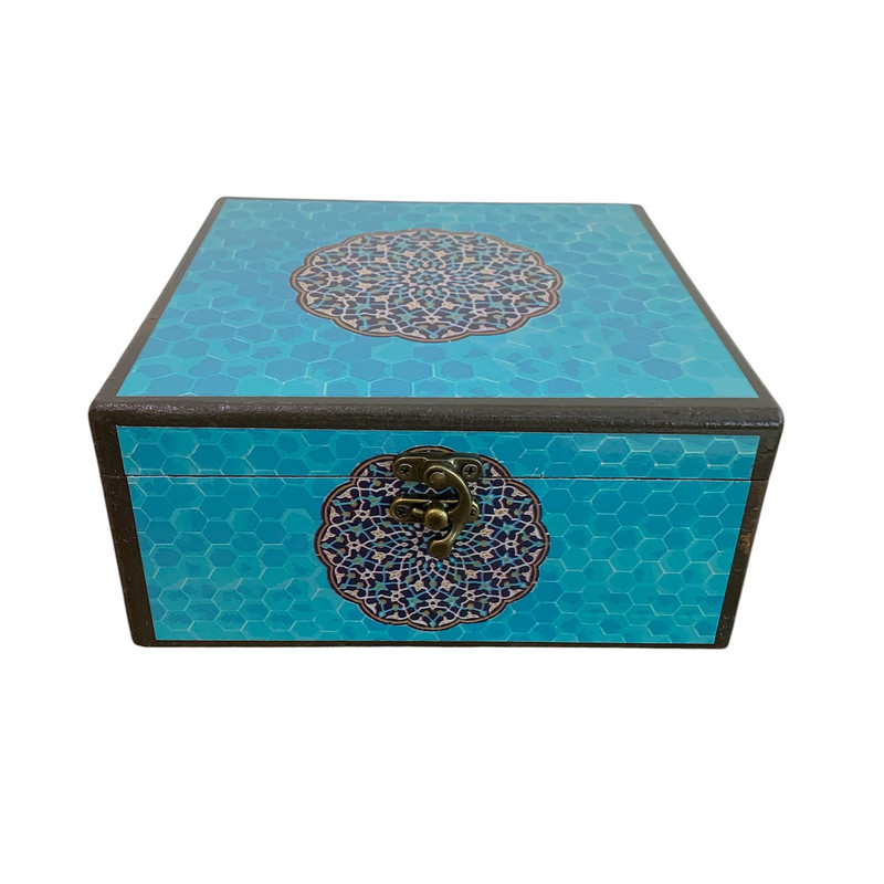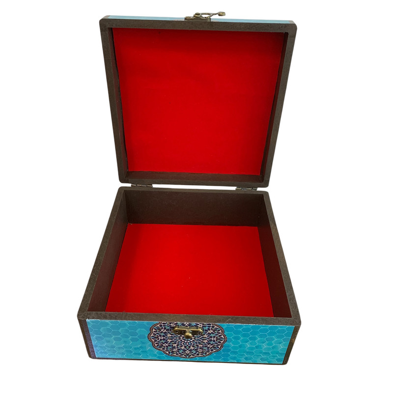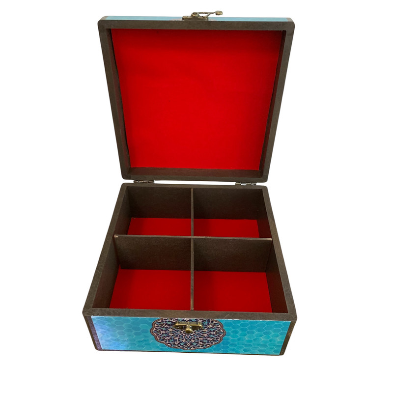 اين محصول جعبه چوبى طرح سنتى به ابعاد 20*20 با ارتفاع 9 سانتى متر است كه درونش به زيبايى مخمل كشى شده و از كيفيت بالايى برخوردار است.درون جعبه با تقسيم كننده فضايى 4 قسمتى را بوجود آورده كه ميتواند مناسب تى بگ،دمنوش يا هر وسيله مد نظرتان باشد.تقسيم كننده درون جعبه متحرك است و اگر مايل بودين فضايى 20*20 داشته باشيد ميتوانيد تقسيم كننده را از جعبه خارج كنيد.